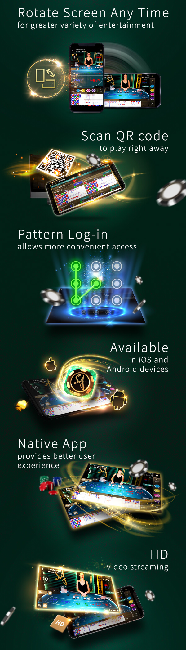 Compatible with both iOS and Android devices, SA APP contains functions of our H5 Mobile, including HD live streaming, and many more. You can scan the QR code and play immediately! There is also pattern log-in, allowing players to log into the game more quickly! You must not miss it!